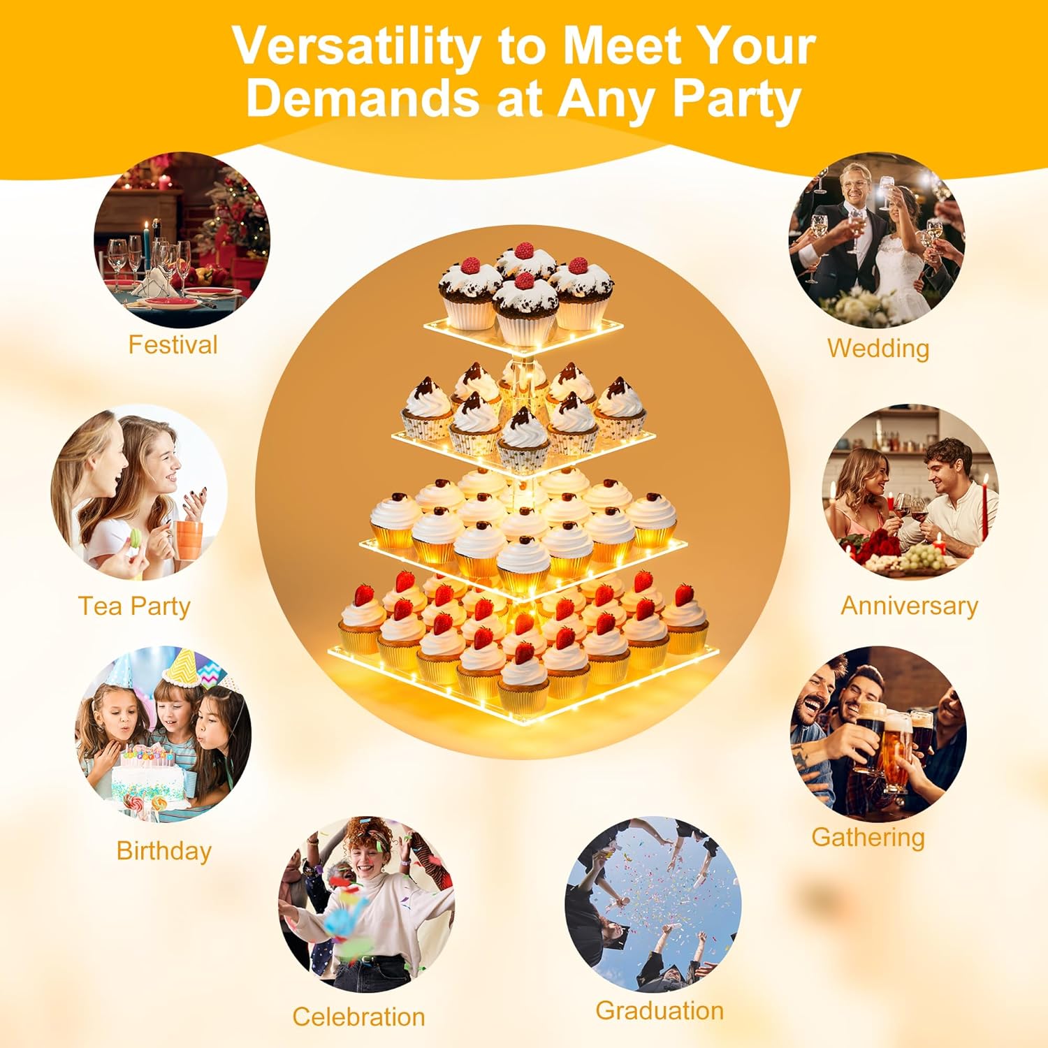 Bulk 2 Pcs Cupcake Stand Holder Acrylic Tower with LED Lighting System Commercial-Grade Dessert Display for Wedding Candy Bars 5-Star Buffets Warm Gold Wholesale