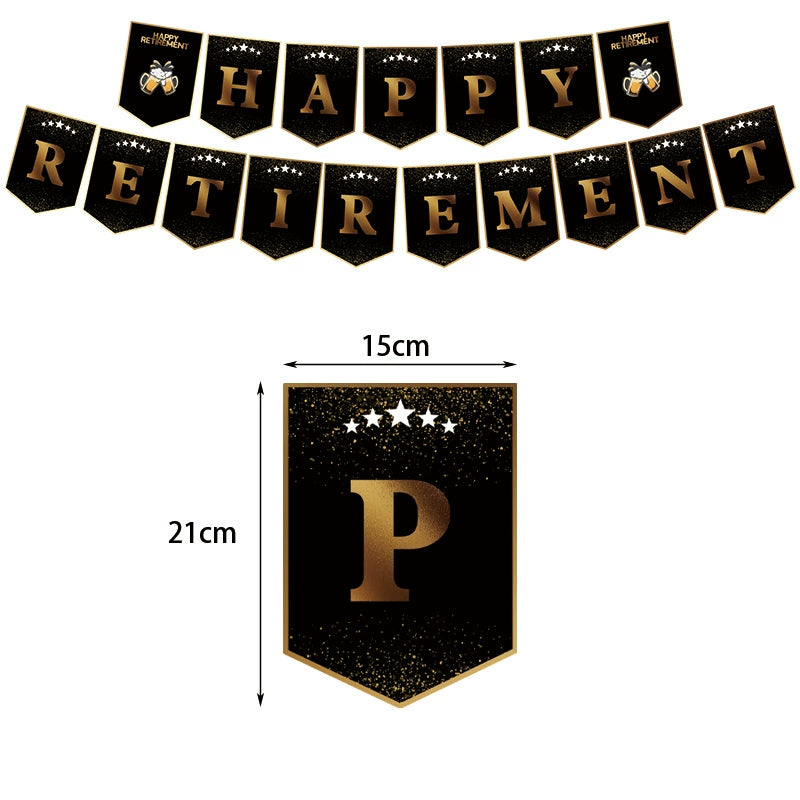 • Banner: 1 “Happy Retirement” banner (the star backdrop — hang it above snack tables or photo corners to set the celebratory tone)