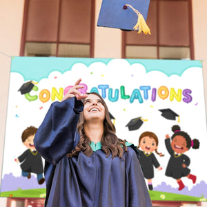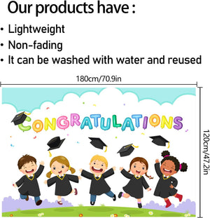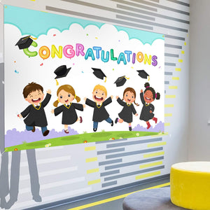 - Make your child's graduation party unforgettable with our stunning 6x4 ft Large White Congratulations Backdrop Banner. This elegant and vibrant banner is the perfect addition to any kindergarten graduation celebration, creating a joyful and memorable atmosphere. Its impressive size ensures it will stand out, becoming a beautiful focal point that will leave a lasting impression on your guests.