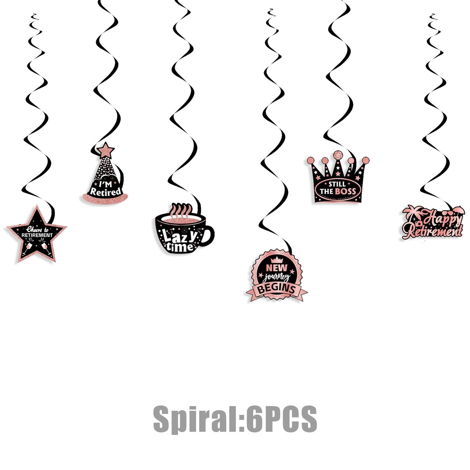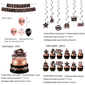 - 6pcs hanging swirls (with fun slogans like “Cheers to Retirement” and “Lazy Time”)