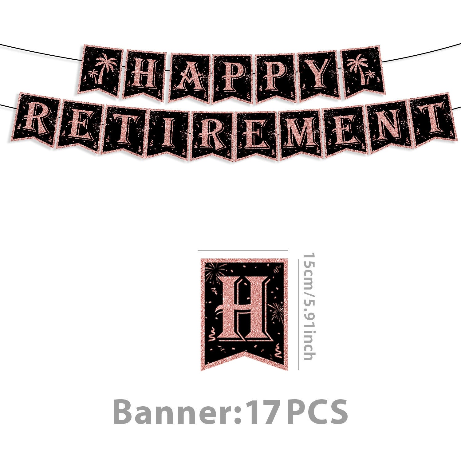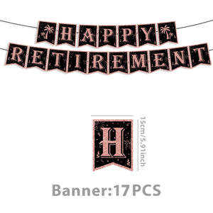- 17pcs “Happy Retirement” glitter banner (plus palm tree accents — hello, vacation mode!)