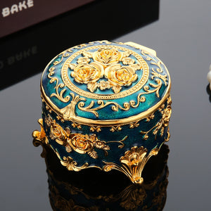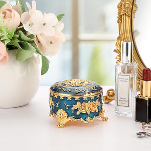 Adorned with intricate Florentine-style floral engravings and antique gold plating, this ornate box exudes old-world charm. The muted jade-blue base (also available in rose blush) pairs with distressed accents for a romantic, storybook aesthetic—perfect for shabby-chic vanities or glamorous dressing tables. -