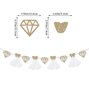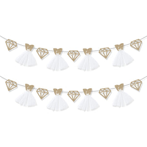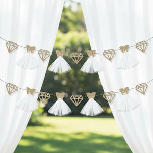 📦 What You Get (2 FULL Sets!): - Each set has 9 eye-catching pieces: glittery gold rings (3.62in), glittery gold diamonds (4.96in), and adorable wedding dress cutouts (with fluffy white paper skirts!) - A 16.4ft (5m) string per set—long enough to drape over walls, photo booths, dessert tables, or even the bridal squad’s backdrop!