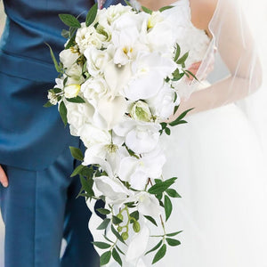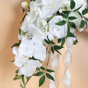Fluid trails of silk orchids cascade like liquid crystal, infusing opulent movement to evoke the magic of storybook nuptials.