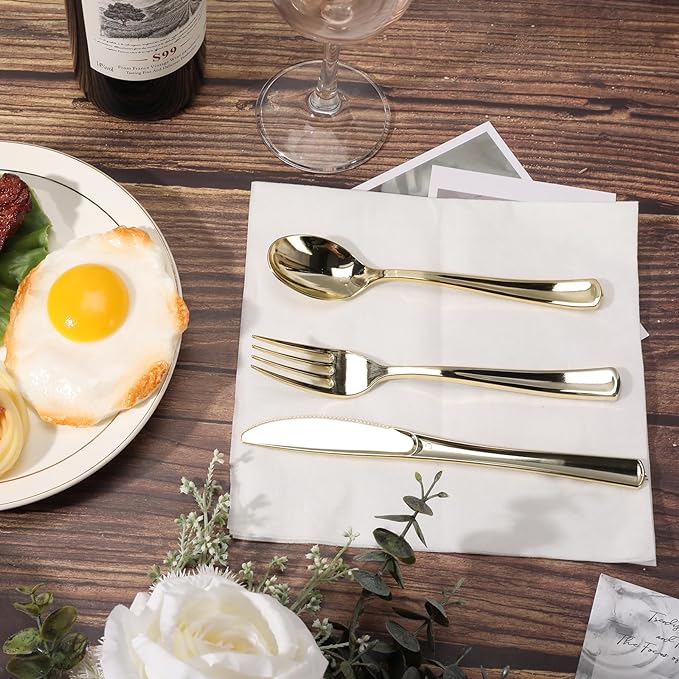 • Made from food grade materials and BPA free. The surface is smooth and not easy to scratch or break. Made of metal paint plating, it has a strong metallic feel, enhances the overall beauty, and adds a sense of luxury to your dining table. 18" x 16" disposable napkins are super soft and thick. Pre-rolled dinnerware is convenient for single use for small gatherings or large gatherings, making the cleanup process effortless. After use, just throw them in the trash. Saves you the chore of hand washing.