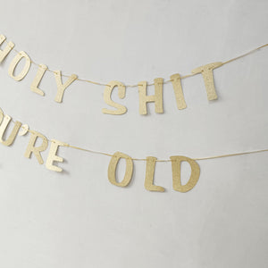 - Each banner has a glitter paper finish with letters that read "Holy Shit You're Old." Super fun and sparkly! Each letter is made from sturdy glitter paper. Real gold glitter adds the perfect touch to your birthday decorations.