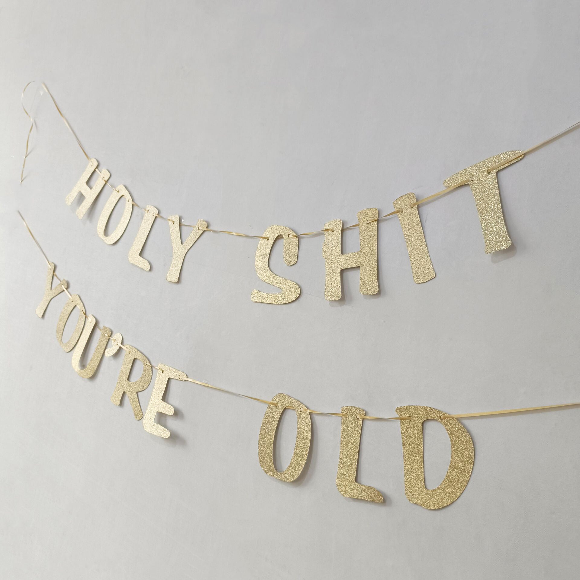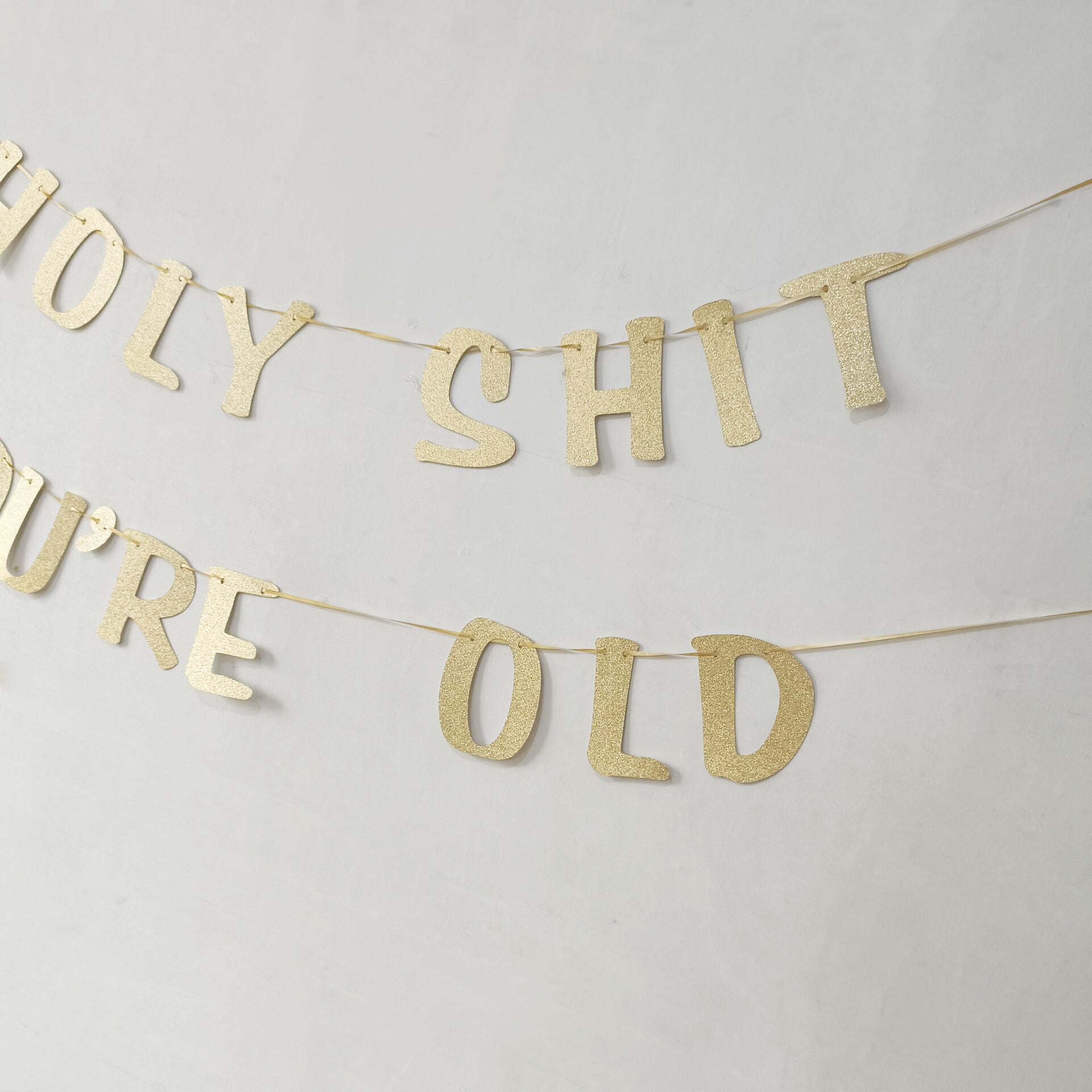 • Each banner has a glitter paper finish with letters that read "Holy Shit You're Old." Super fun and sparkly! Each letter is made from sturdy glitter paper. Real gold glitter adds the perfect touch to your birthday decorations.