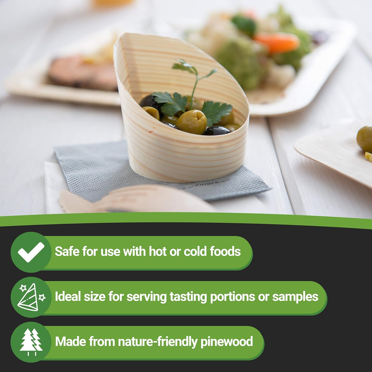 - 100 Disposable Cups: Each mini slanted cup measures 2.5 inches in diameter, 2.8 inches in height, and holds 4 ounces. Each order includes 100 wooden slanted cups.