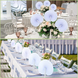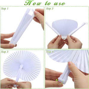 - Package Contents: you will receive 100 pcs white round shaped paper fans, the folded size is about 5.7 x 1.6 inch, and the unfolded size measures approx.10.2 x 9.6 inch, enough decorating your weddings celebrations, birthday party, home decoration and more