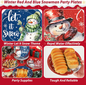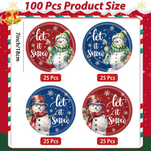 Bulk 100Pcs 7-Inch Let It Snow Christmas Paper Plates – Snowman Themed Red and Blue Party Tableware for Holiday Celebrations Wholesale