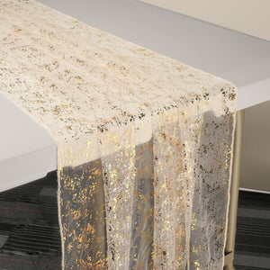 - Golden foil finish on a soft gauze texture table runner, adding a delicate touch to the table décor and enhancing an elegant atmosphere.