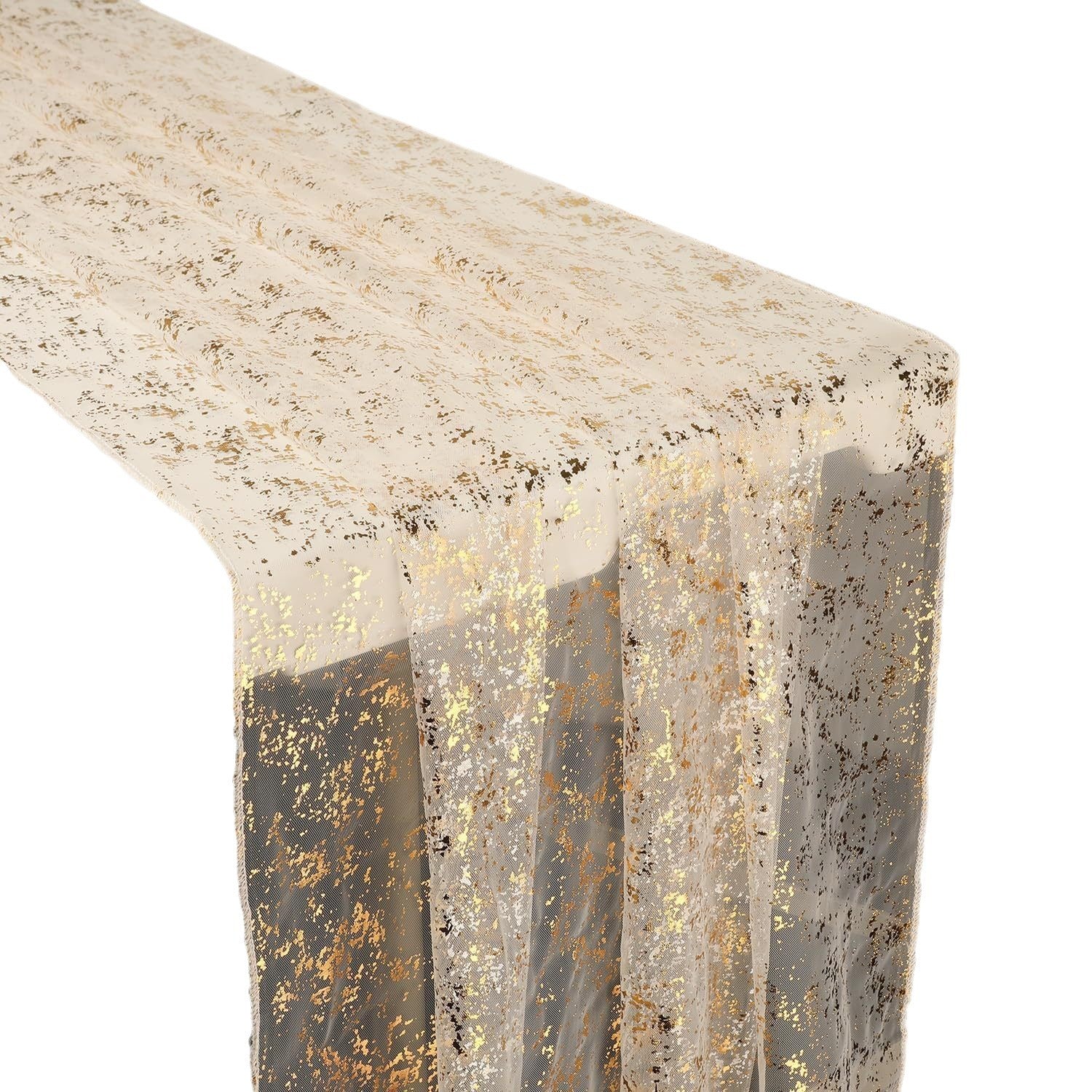 • Golden foil finish on a soft gauze texture table runner, adding a delicate touch to the table décor and enhancing an elegant atmosphere.