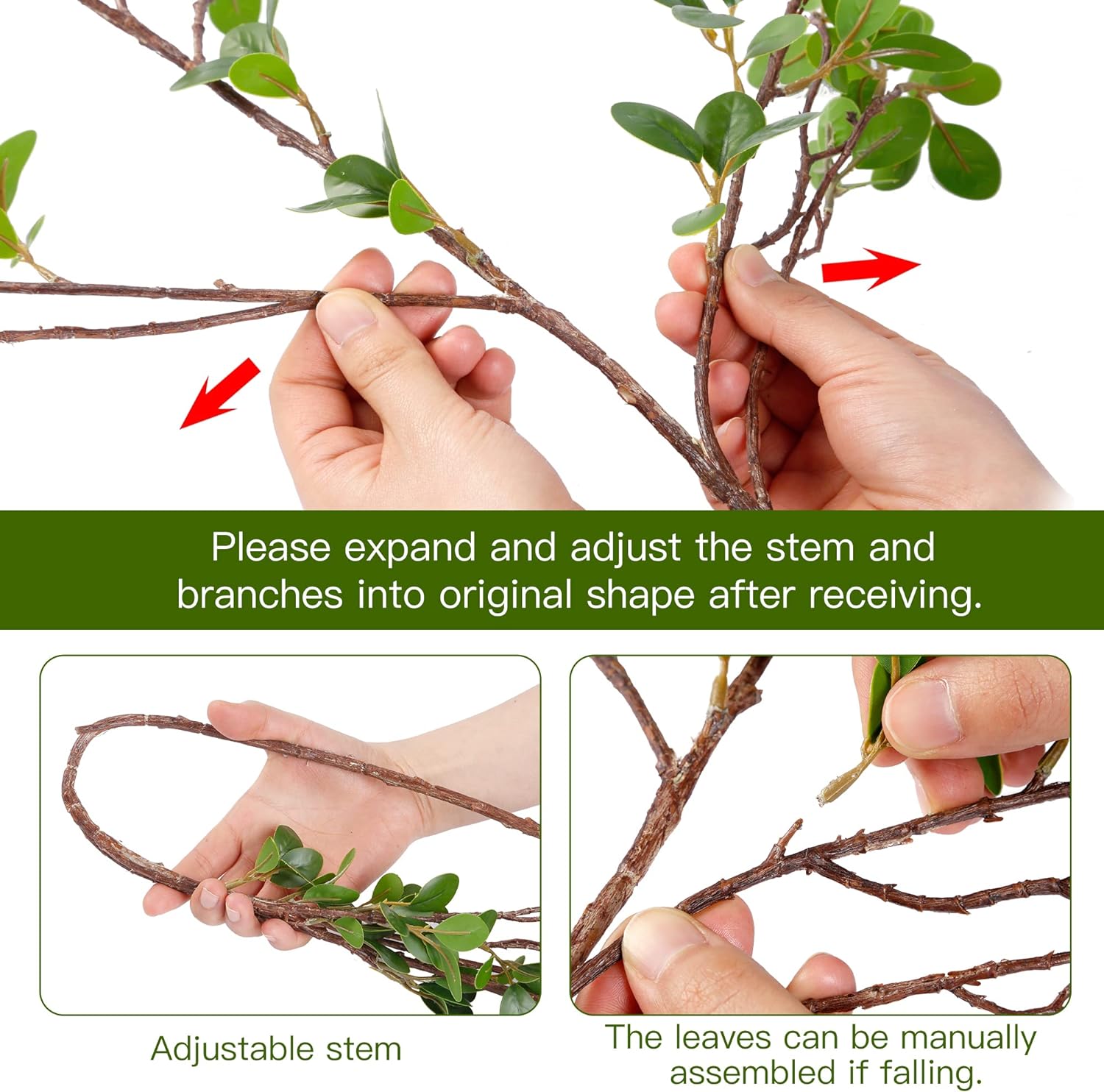 • Packaging and Size: Each pack contains 4 artificial Ficus branches, each measuring 43 inches tall. Every green eucalyptus branch feature 7 flexible stems (vase not included). The stems can be easily trimmed or bent to fit any vase size, guaranteeing a perfect arrangement every time without worrying about matching the picture.