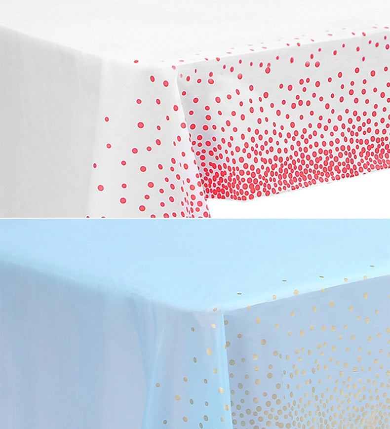 • These plastic tablecloths are disposable, rectangular tablecloths designed with a plain background and printed with foil dots to add more charm to your dining table. Perfect for cleaning up any messy spills from food, drinks, paint, etc., so you don't have to worry about cleanup. Plus, if you wish, you can wipe the tablecloths clean with a damp cloth for next use as they have a non-stick coating layer. They are non-toxic, odorless and require no cleaning.