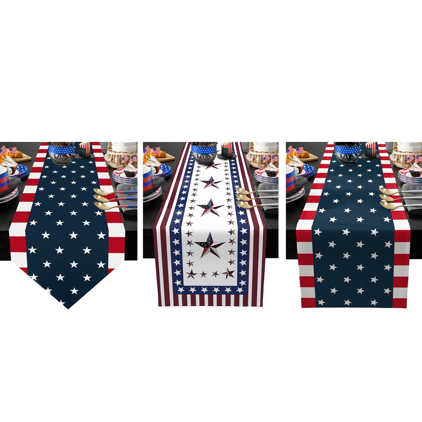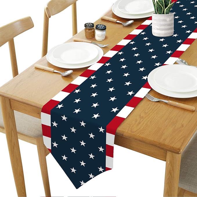 This tablecloth is made of cotton linen and printed with a unique pattern. It does not stick to the skin when eating, is not hot and humid, and is breathable. Durable, environmentally friendly and safe. It is soft and durable, flat and smooth, not prone to wrinkles, and can protect your table from damage and burns. Table runner with American flag elements for home decoration on the 4th of July.