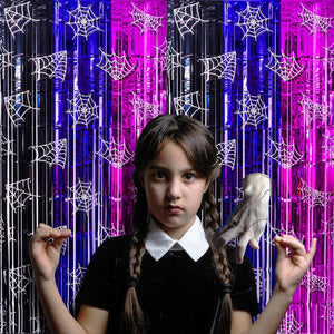 - Versatile Application: Our Spider Web Foil Fringe Curtains are versatile and suitable for various occasions, including spider-themed parties, children's birthday celebrations, live stream backdrops, dessert table decorations, stage settings, disco parties, bar ambiance enhancement, and office decor