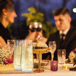 - Made of thickened and highly transparent PET plastic material, BPA-free. It guarantees sturdiness while providing excellent transparency, making your drinks more eye-catching. Thickened plastic material makes the champagne glass stronger and less likely to deform. 9 oz clear plastic champagne glasses complement any color drink. PET plastic champagne flutes are not suitable for use in environments above 45°C (113°F). High temperatures will deform and melt the plastic glass, and they are not dishwasher safe!