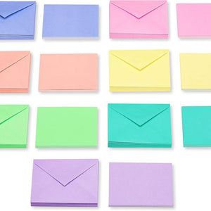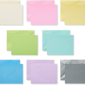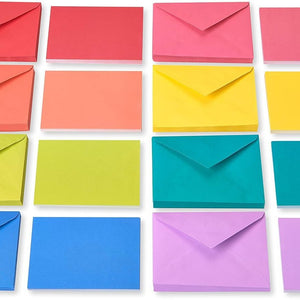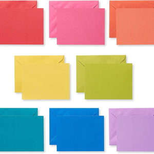 - Cards and envelopes come in red, pink, orange, yellow, bright green, teal, blue and purple; 3 of each color