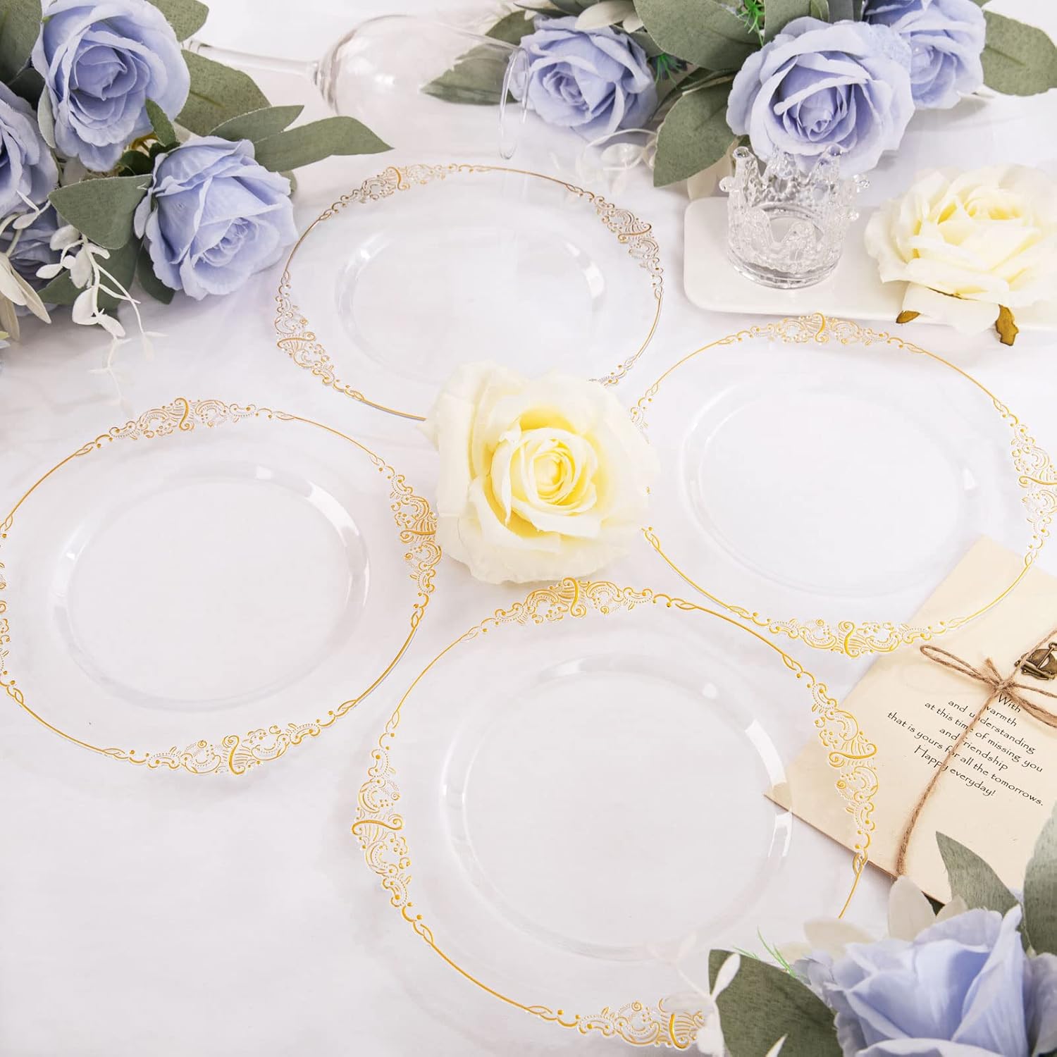Elevate your dining experience with our Gold Rim Clear Plastic Plates, designed for elegance and convenience. Perfect for weddings, parties, and Thanksgiving celebrations, these plates will add a touch of luxury to any occasion.
