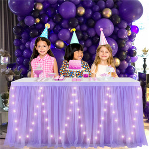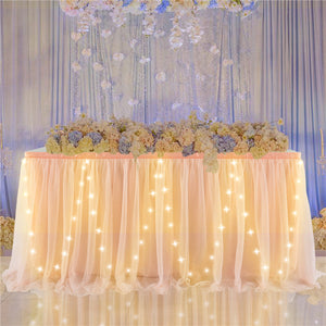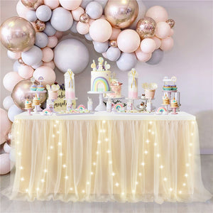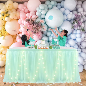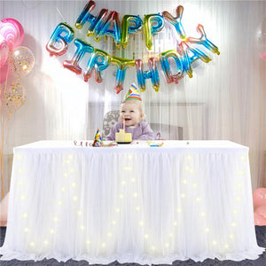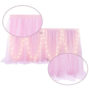 - Illuminate your party ambiance with our exquisite Lace Ribbon LED Table Skirt! Proudly presenting the perfect adornment for your party decor needs. The delicate lace ribbon combined with dazzling LED string lights adds a touch of romance and elegance to wedding parties, family gatherings, and night events. Whether it's a family reunion, birthday celebration, or holiday party, our table skirt will bring a unique decorative effect to your table edges.