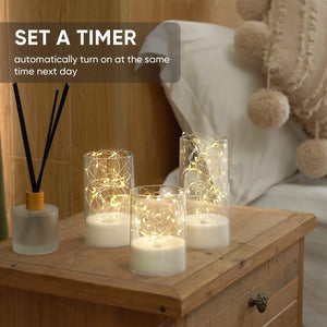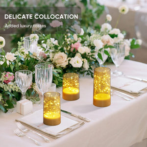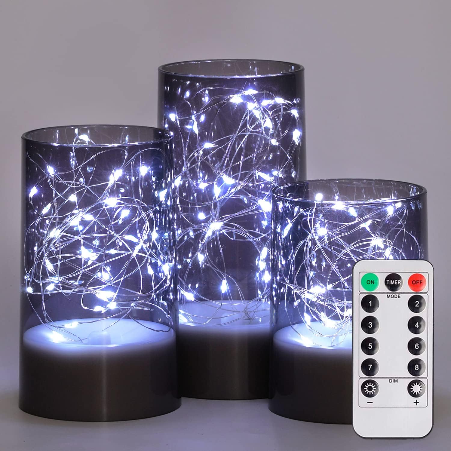 - Cool Elegant Appearance: Each set of smoke colored glass candle with cylinder built-in at least 35 Leds fairy lights adopts a unique flameless candle shape, which is like filling the vase with star. The red light of candle uses a cylinder shell, which will be more transparent after turning on the light, which give off is so calming and beautiful.