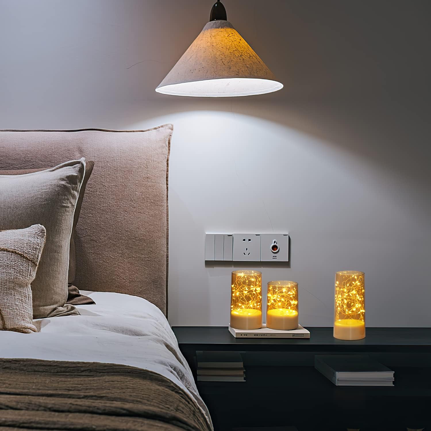 • Cool Elegant Appearance: Each set of smoke colored glass candle with cylinder built-in at least 35 Leds fairy lights adopts a unique flameless candle shape, which is like filling the vase with star. The red light of candle uses a cylinder shell, which will be more transparent after turning on the light, which give off is so calming and beautiful.