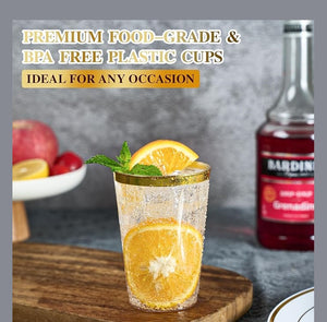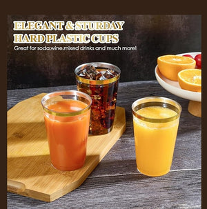 - These hard plastic cups are made from 100% food-grade plastic, BPA-free and reusable. Heavy-duty plastic cups provide reliable strength, ensuring they won't be easily scratched or broken. The 12 oz plastic cup with gold rim is not only sturdy and practical, but also adds elegance to your party.