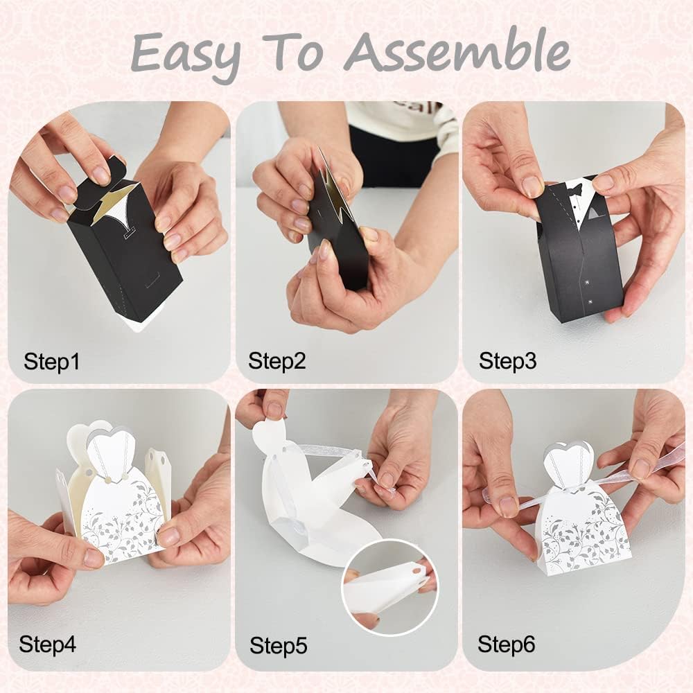 Bulk 50 Pcs Bride & Groom Wedding Party Favor Boxes Set Elegant Dress & Tuxedo Themed Candy Gift Boxes for Bridal Showers Receptions Party Decor Wholesale