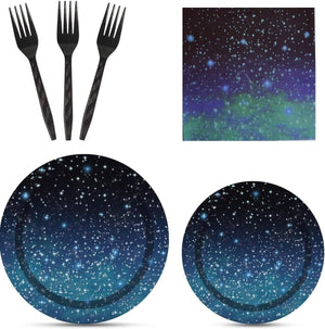 Includes 10 x 9-inch space-themed paper plates, 10 x 7-inch dessert plates, 20 x space-printed napkins, and 10 x forks. Designed to cater for 10 guests, this set ensures everyone is covered. -