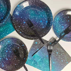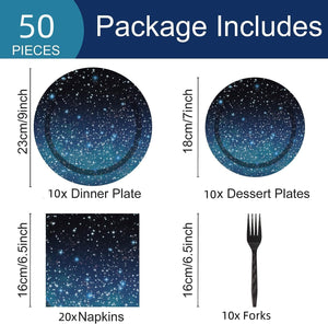 10 x 9-inch paper plates, 10 x 7-inch dessert plates, 20 x space-themed napkins, and 10 x forks. This comprehensive set provides a complete dining experience for your party guests. -