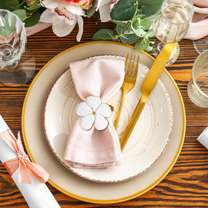 - Adorn your table with these exquisite White Flower Napkin Rings. Crafted from high-quality metal, they feature a captivating floral design that adds a touch of luxury to any occasion. Their versatile size makes them suitable for a variety of napkin styles, while their durable construction ensures long-lasting use. Whether you're hosting a wedding reception or a festive holiday party, these napkin rings are sure to impress your guests with their elegant charm.