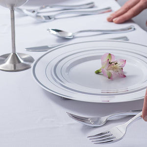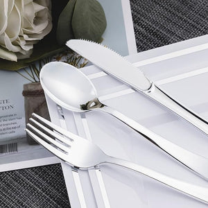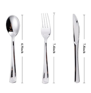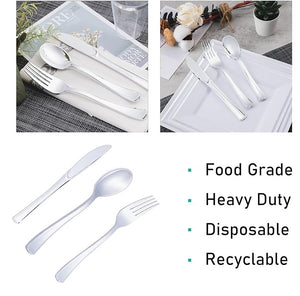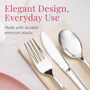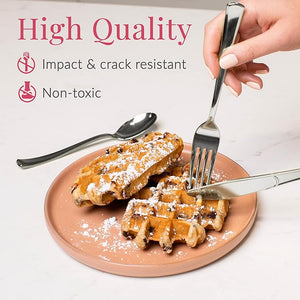- Made of 100% food-grade plastic, non-toxic, BPA-free and recyclable. With the same glossy surface as real metal cutlery, it is well made and not easily deformed. You can throw away this plastic silverware after the party, or you can hand wash and reuse. Not microwave or dishwasher safe.