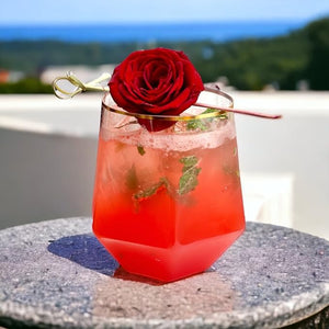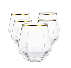 - Made of PET plastic material, the stemless plastic wine glasses are extra thick, BPA-free, non-toxic, durable, and 100% food-grade plastic drinkware that is safe for you and your guests. Unbreakable, recyclable, shatterproof, crystal clear plastic with smooth rounded gold edges. The disposable 12 oz gold rim wine glass is perfect for any type of drinking and feels comfortable, natural, modern and stylish. Its shape allows your wine to fully access the air, and its smooth edges are gentle on your lips, giving you a pleasant drinking experience.