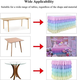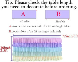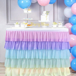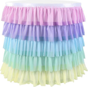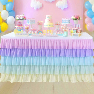 - Rainbow Unicorn Table Skirt's Material: The layered rainbow table skirt is made of high-end soft chiffon featuring good draping and wrinkle resistance.