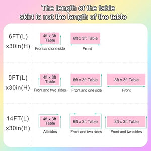 - Occasions: The rainbow table skirt is perfect for your unicorn birthday party, baby shower, mermaid birthday party, JoJo party, 1st birthday party decorations, or home decor supplies. It's a great decoration for dessert tables, candy tables, cake tables, buffet tables, and sweet tables.