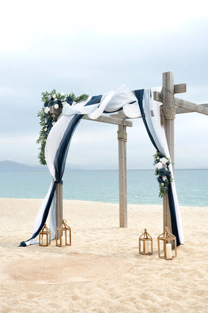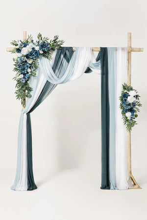 - Chiffon Drapes: 315″ (26.2 ft) long x 30″ wide (Ice Blue, Navy, White)