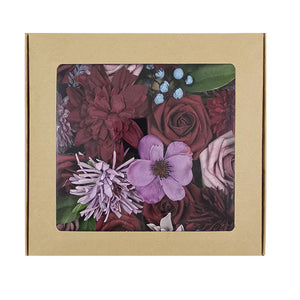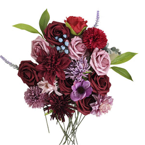 - Wedding flower package details: Burgundy brush rose x2, Pink brush rose x2, Purple chrysanthemums x1, Red silk rose x1, Burgundy Dahlia x1, Burgundy Dahlia chrysanthemums x1,Crab cactus chrysanthemums x1,Poppy x1, Blue Berries x1, Lavender x2, Eucalyptus Leaf x1, Olive Leaf x2