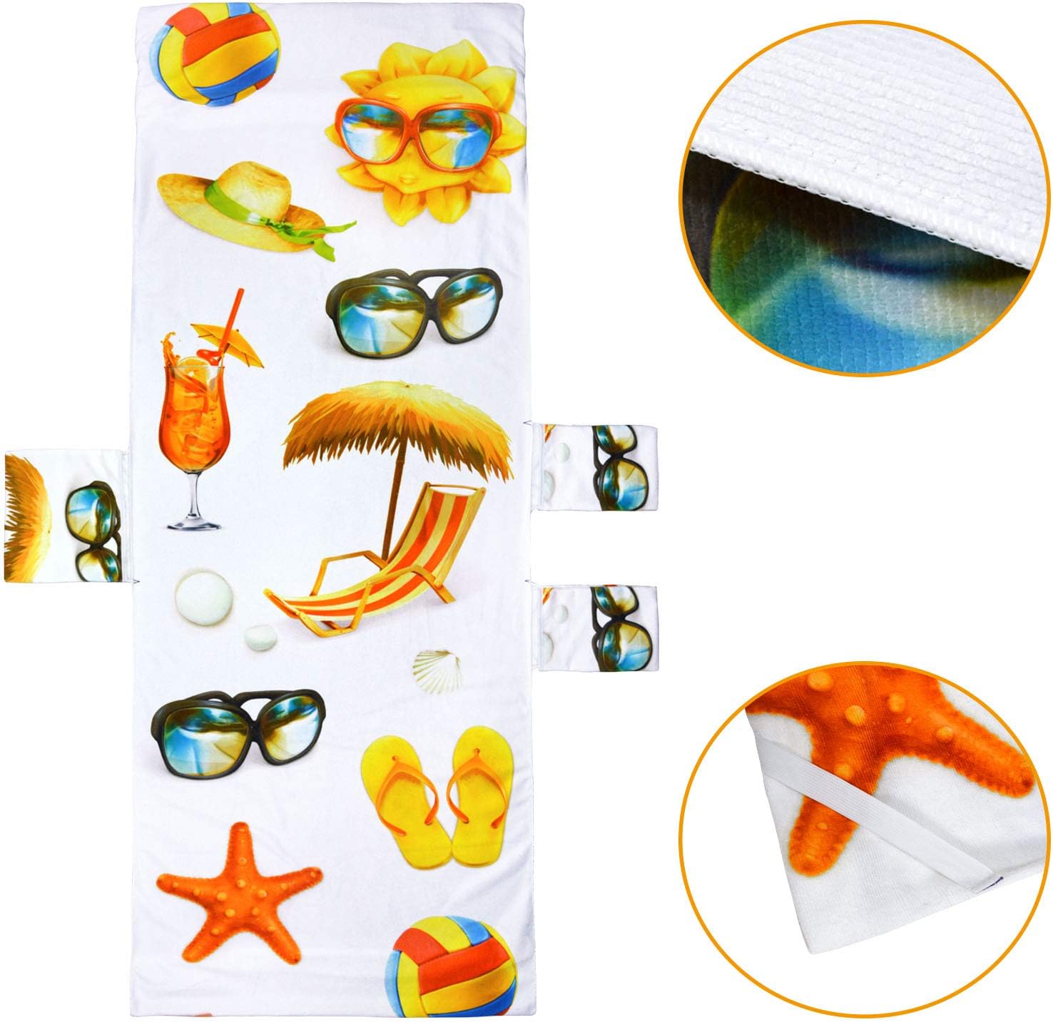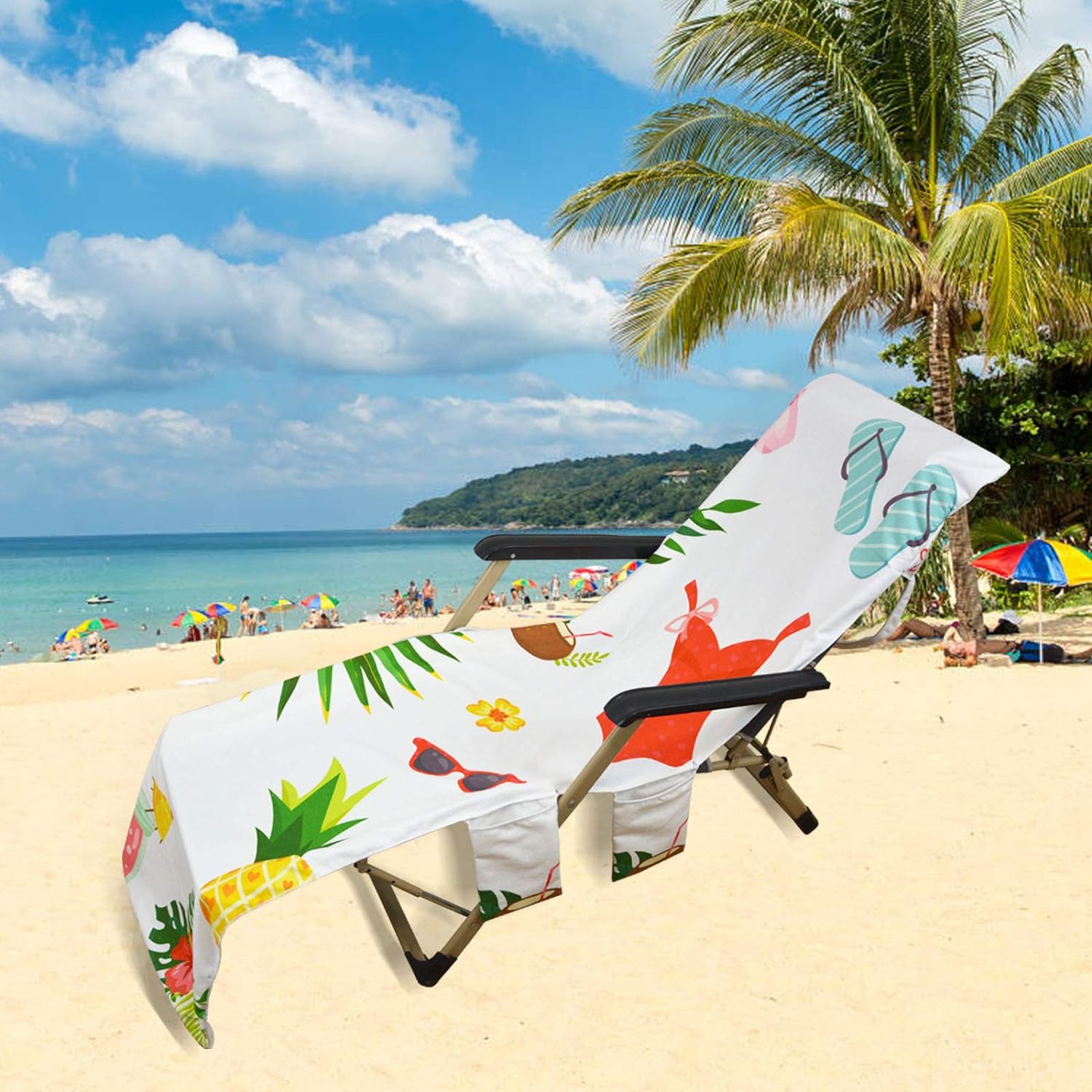 • Upgrade your beach experience with our Beach Folding Chair Cover with Pockets. Crafted from absorbent and soft microfiber and terry material, this chair cover is perfect for lounging in the sun or enjoying poolside parties. Its convenient size of approximately L85"×W30"/215cm×75cm fits most patio loungers, and the fun pattern featuring sunglasses, sea waves, and beaches adds a touch of summer vibes to your setup. With three handy pockets, you can store your essentials like sunglasses, sunscreen, and snacks while soaking up the sun. Plus, it's machine washable and quick-drying for easy maintenance.