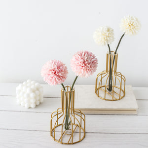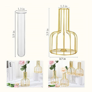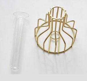 - Composed of a golden metal frame and a hanging glass tube, the material is hard, not easily deformed, the lines are smooth, the shape presents a geometric frame, the center is hollow, light weight, detachable design, easy to take out and put in, unique shape. The built-in crystal clear test tube glass allows the flower arrangement to be removed and the water changed. Suitable for growing flowers and plants, and can also be used for dried flower decoration.