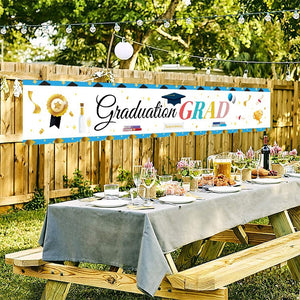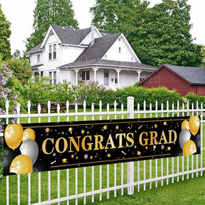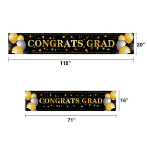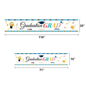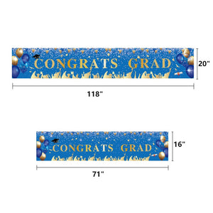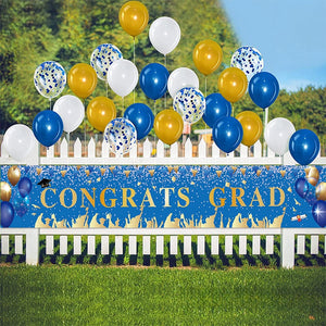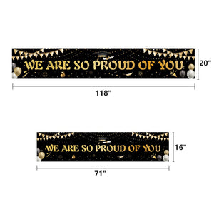 - Made of high density 100% polyester. Sturdy and durable, reusable, high color fastness and not easy to fade. The banner features "WE ARE SO PROUD OF YOU" and "CONGRATS GRAD" in white and is decorated with graduation caps, polka dots and balloons to enhance the atmosphere of your graduation party.