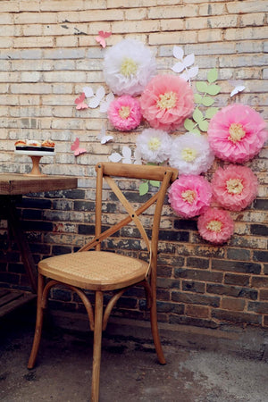 - Product Details: 3 x 6-inch paper flowers, 3 x 8-inch paper flower balls, 3 x 10-inch paper flower balls, 6 leaves (3 white + 3 green), 6 butterflies (3 white + 3 pink), 40 glue dots (2 sheets, 20 dots/sheet)