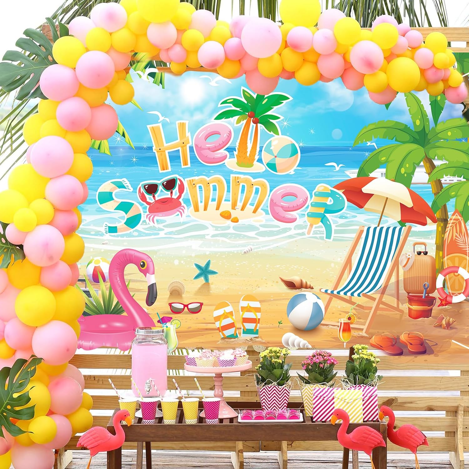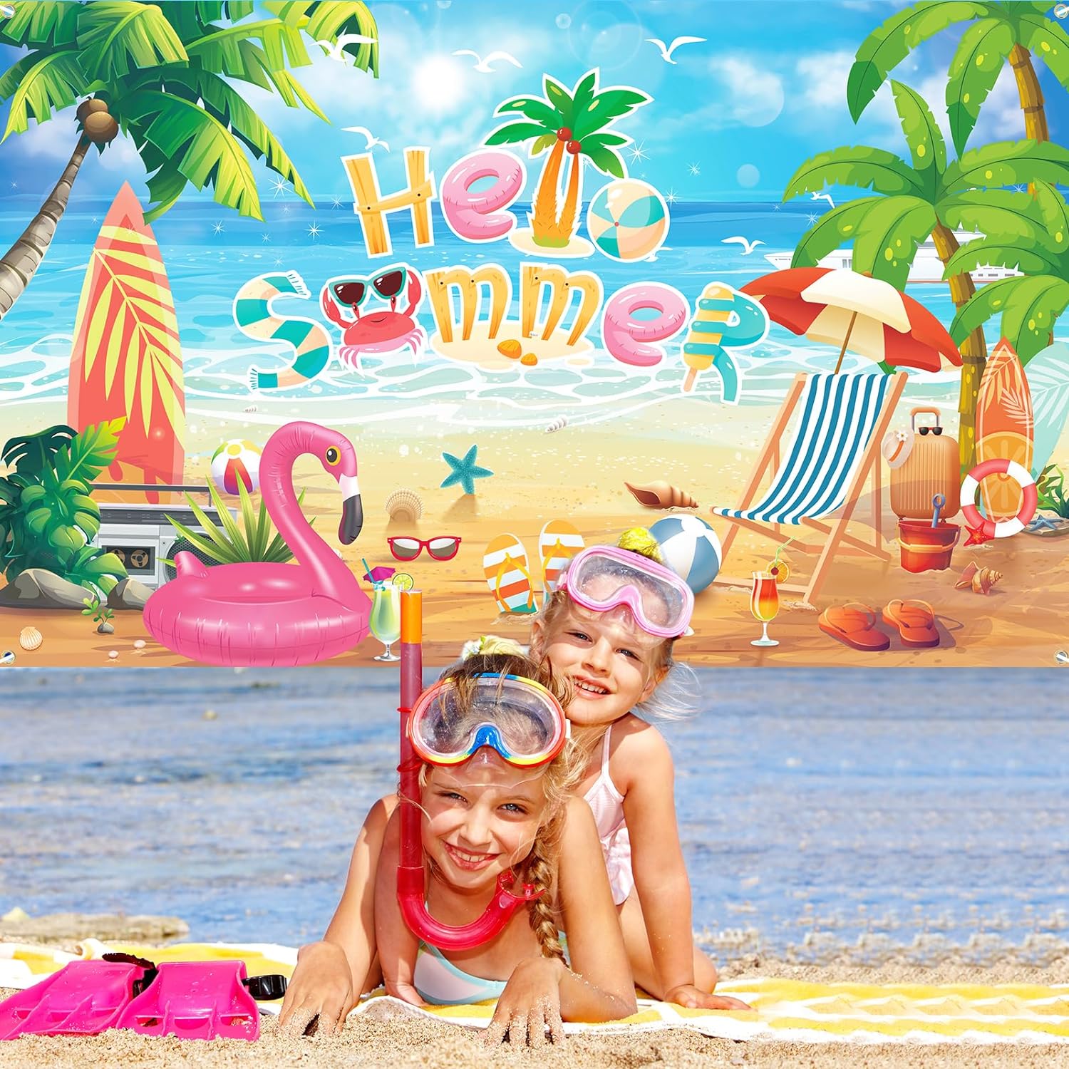 • Bring the vibrant energy of summer to your events with our Summer Tropical Beach Pool Party Photo Backdrop Banner. Featuring colorful elements like palm trees, sand, flip-flops, drinks, surfboards, and cheerful "Hello Summer" messaging, this backdrop transforms any space into a tropical paradise.