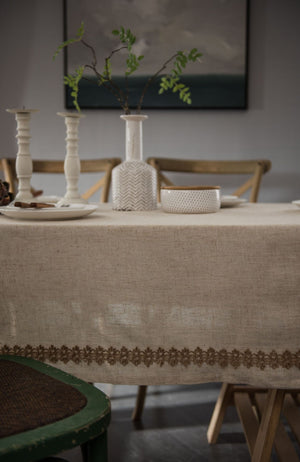 - The tablecloth is made of polyester and linen material, which has a natural linen texture and excellent wrinkle resistance and durability, while giving you a comfortable touch. The tablecloth is soft and breathable, giving it a light, fresh feel.