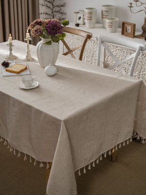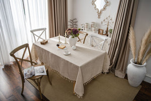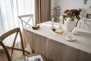 - The tablecloth is made of polyester and linen solid color material, which is soft and comfortable, and has the characteristics of easy care of polyester. The carefully designed tassel decoration adds color to the tablecloth. The tablecloth has a flat surface and a delicate feel, providing an elegant touch to your dining experience.