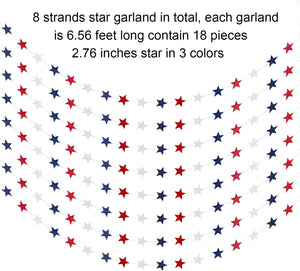 - Quantity: Includes 8 garlands, each with 18 stars in red, white, and blue