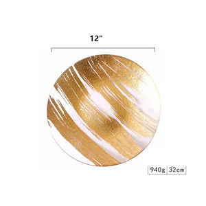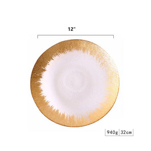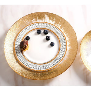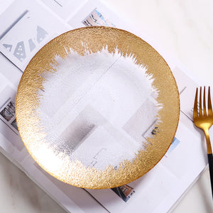 - This dinner plate is not only suitable for placing fruits, pastries, steaks and other delicacies, but can also be used as a decorative plate or placeholder. Whether it's a family dinner, a banquet or a special occasion celebration, a gold glass place plate will enhance your occasion.