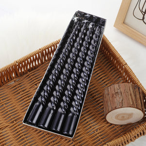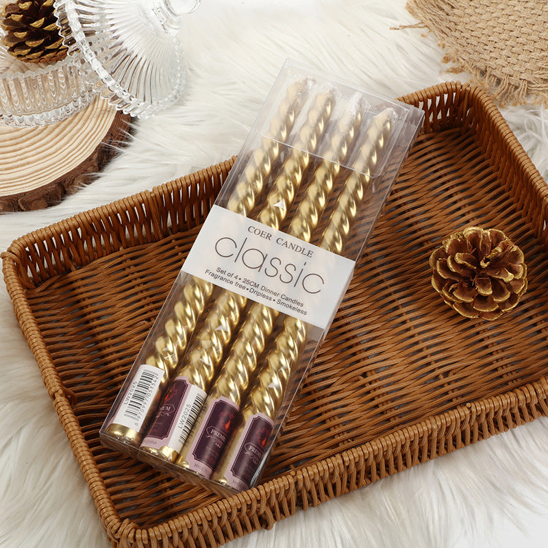 - The spiral tapered candle design features a beautifully plated finish for an elegant metallic look style, and is made with high-quality paraffin wax and natural cotton lead-free wick for a clean and stable flame that burns cleanly for 7-8.5 hours. The melting point and burning speed are precisely controlled through a special formula process, and the special metalized film makes the candle burn more evenly and stably. It almost does not drip when there is no wind in the vertical center of gravity, which is better than other tapered candles. Enjoy the party without worrying about wax mess. Our non-drip slim candles ensure a clean burn, leaving your tablecloths and surfaces spotless.