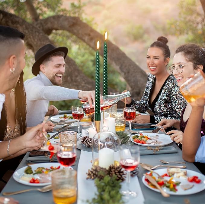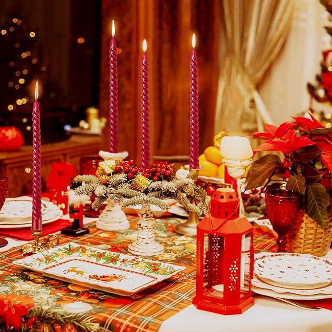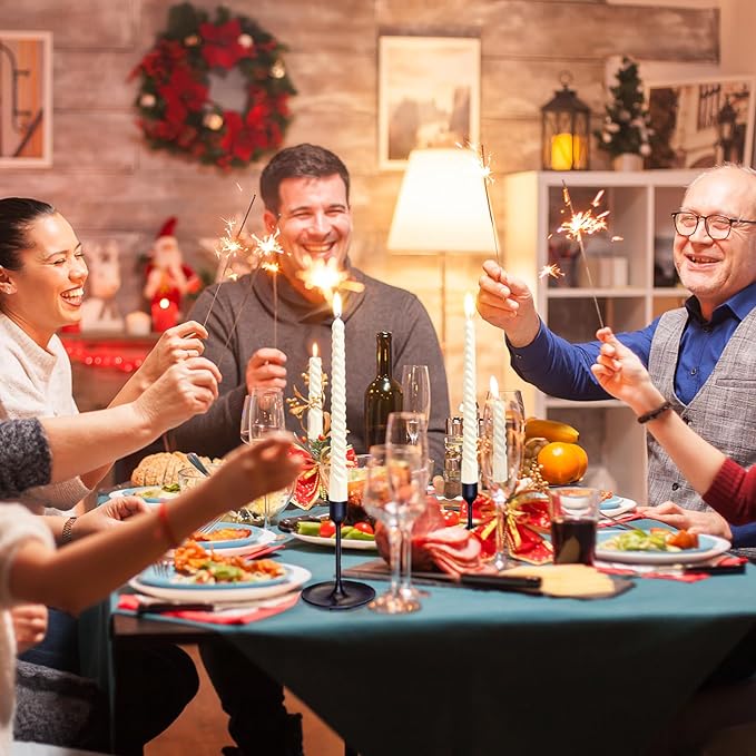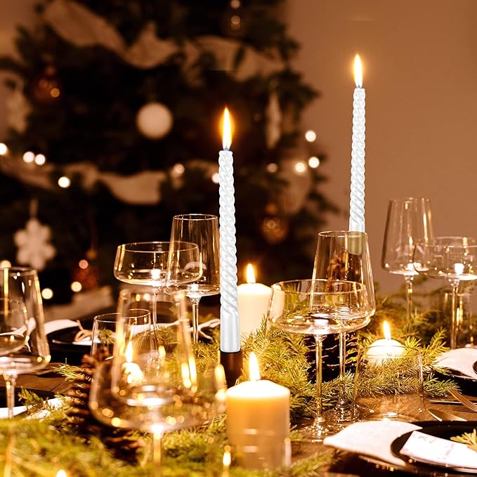 The spiral tapered candle design features a beautifully plated finish for an elegant metallic look style, and is made with high-quality paraffin wax and natural cotton lead-free wick for a clean and stable flame that burns cleanly for 7-8.5 hours. The melting point and burning speed are precisely controlled through a special formula process, and the special metalized film makes the candle burn more evenly and stably. It almost does not drip when there is no wind in the vertical center of gravity, which is better than other tapered candles. Enjoy the party without worrying about wax mess. Our non-drip slim candles ensure a clean burn, leaving your tablecloths and surfaces spotless.