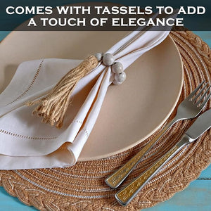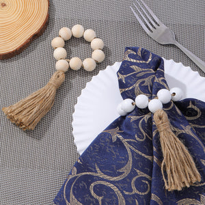 - Transform your dining experience with our Wood Bead Tassel Napkin Rings and infuse your table setting with rustic charm and understated elegance. Intricate beading and delicate tassel details add a unique, handmade charm to these napkin rings. It becomes an eye-catching accessory in the table setting. Whether you're hosting a casual brunch with friends or a formal dinner, these napkin rings are sure to impress your guests and enhance the ambience of any occasion.