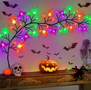 - Elevate your Halloween décor with our creatively designed 6 FT Halloween Willow Vine Lights. Featuring 18 large branches, 54 lights including 18 pumpkin, bat, and spider lights, and 36 orange, purple, and green LED lights, this garland creates a fun and eerie atmosphere, perfect for your home or party.